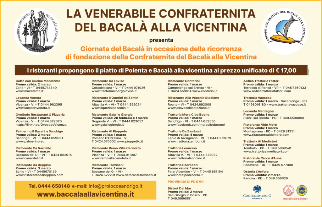 Un compleanno da festeggiare. In occasione del compleanno della Venerabile Confraternita, il 1° marzo, ritornano così le giornate promozionali per degustare il miglior Bacalà alla vicentina. “Promozionali” per dare la possibilità di degustare a un prezzo